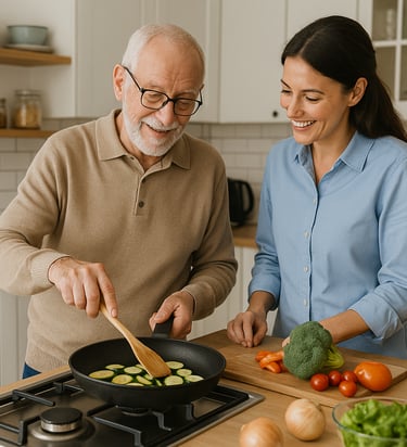 Au-delà de l'aspect nutritionnel, ces moments de préparation sont aussi des instants d'échange et de convivialité : lorsque la personne le souhaite, l'auxiliaire favorise la participation ou le partage du repas, afin de maintenir le lien social et le plaisir de manger.
