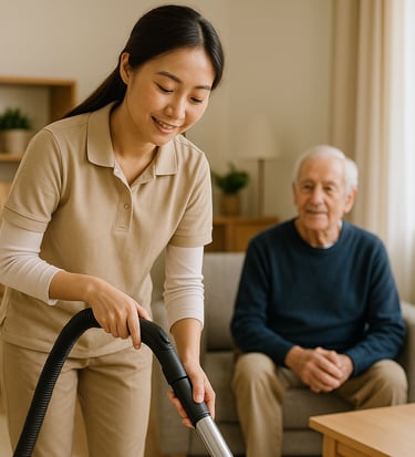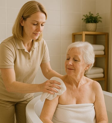L'auxiliaire de vie intervient avec bienveillance et discrétion pour accompagner la personne dans ses gestes d'hygiéne quotidienne, tout en veillant à préserver sa dignité et son intimité.